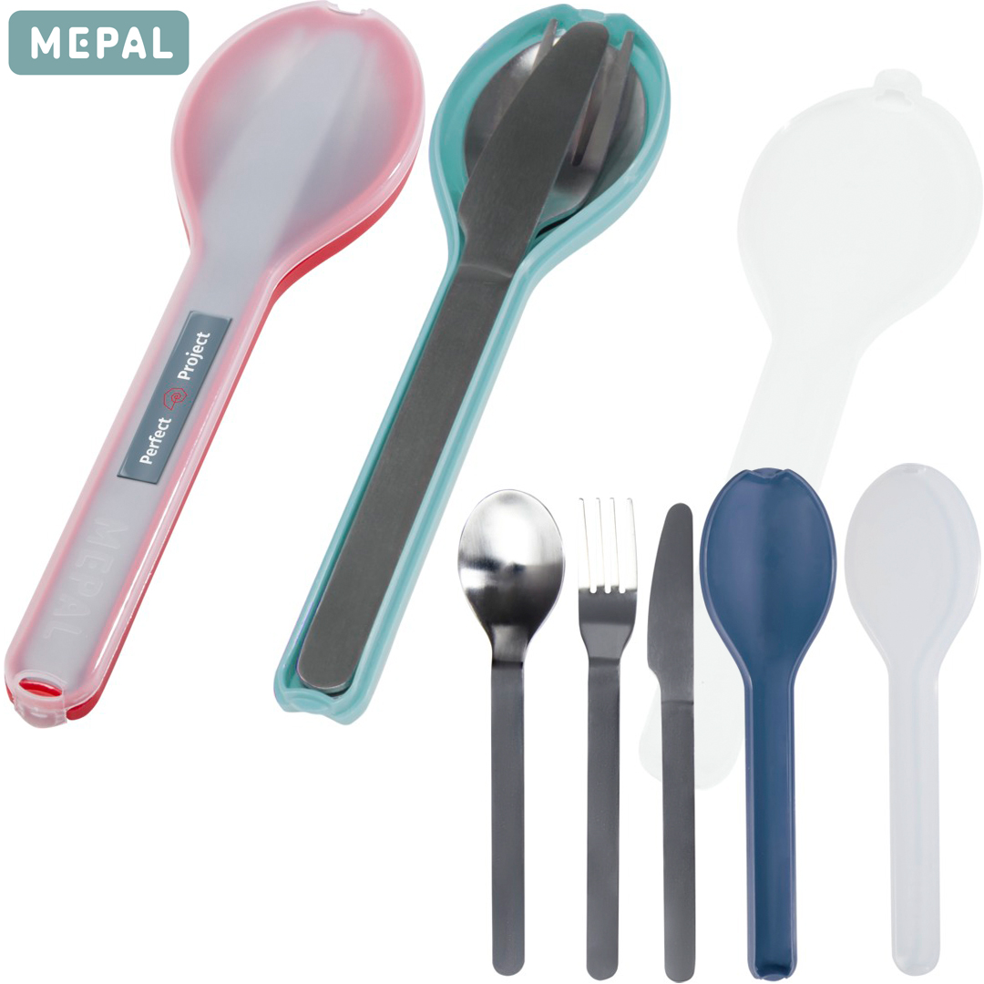 Y para acabar, un artículo MEPAL complementario de todos los anteriores. Un set de tres cubiertos metálicos de acero inoxidable (aptos para lavavajillas), protegidos en un ingenioso y compacto estuche de transporte para que estén protegidos e higiénicamente empaquetados.