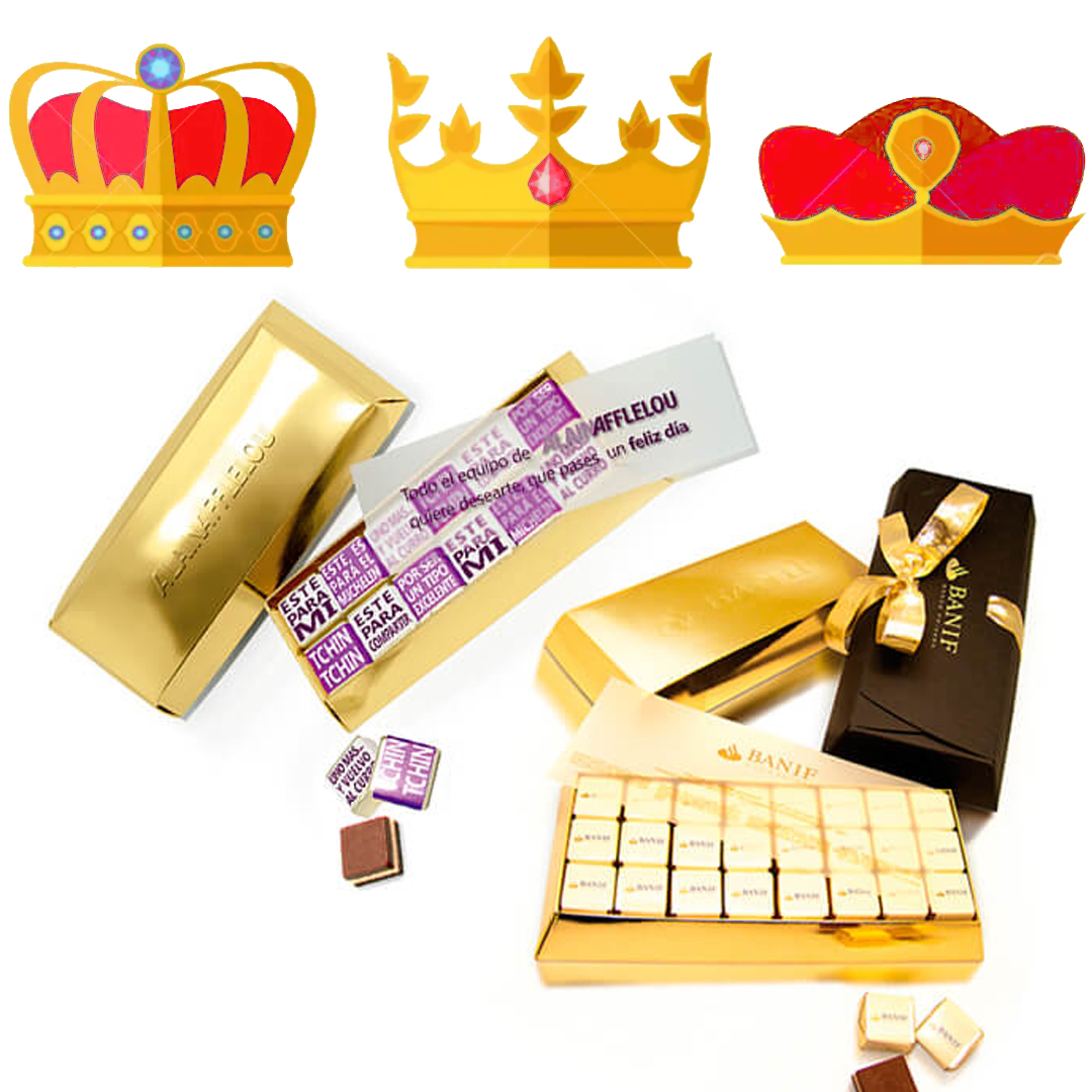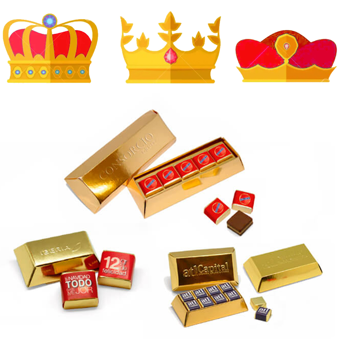 Para el oro tenemos unas cajas de cartón metalizado con forma de lingotes y en en interior deliciosos bombones de chocolate. Con más o menos bombones, y cajas más grandes o más pqeueñas según lo golosos que seáis. Y personalizados con vuestro logo o diseño en las vitolas a color, y en golpe seco en los lingotes. Un artículo promocional elegante y muy apetecible.