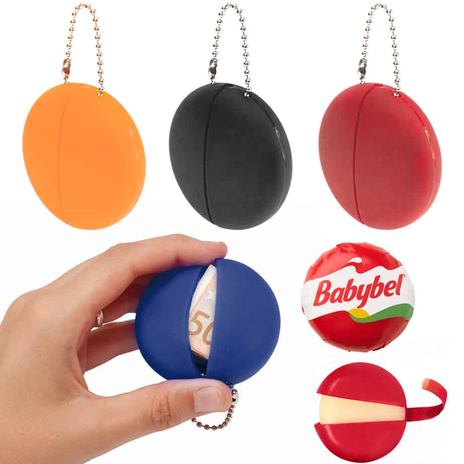 Un monedero de original diseño circular con cuerpo acabado en suave silicona de variada gama de colores, con un compartimento principal que se abre a presión y cadena de transporte. Además de ser personalizable con vuestro logo, y disponible en varios colores… el rojo, por su forma, textura, tamaño, color y forma de abrirlo, ¿no os recuerda a los Mini Babybel®?