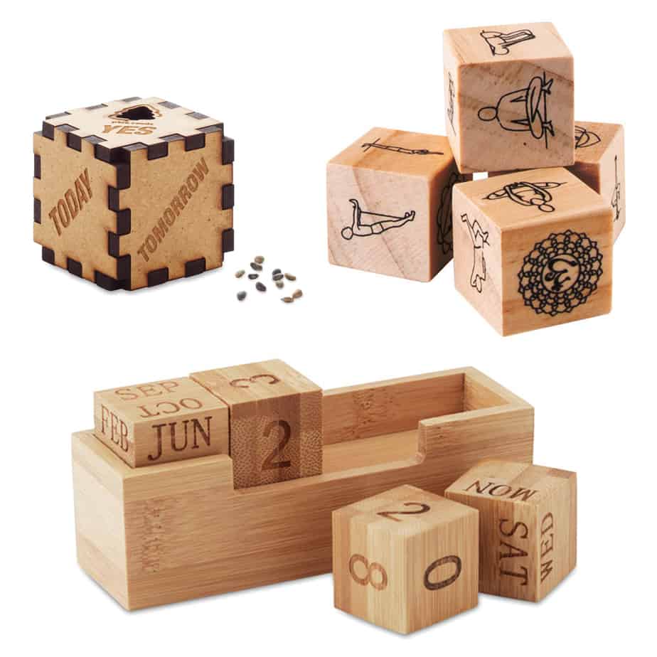 Un dado de seis caras es un cubo, pero no todos los cubos son dados, y de dados, nosotros entendemos bastante. Puede puede servir para tomar de decisiones (Yes, No, Maybe, Today, Tomorrow), y tener unas semillas de pino para dar una nueva vida al planeta, con un árbol que crece unos 30 cm por año. Puede ser un juego de yoga elaborado con varios dados y posturas diferentes cada uno, personalizando la bolsita de algodón que los guarda. E incluso puede ser un calendario perpetuo para el escritorio, con vuestro logo a láser o a color en la base. Además, son de madera y bambú, materiales sostenibles y ecológicos.