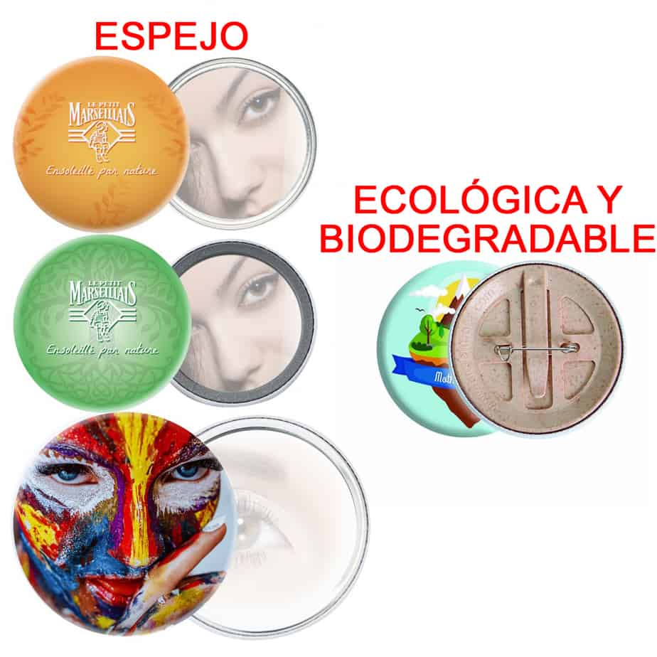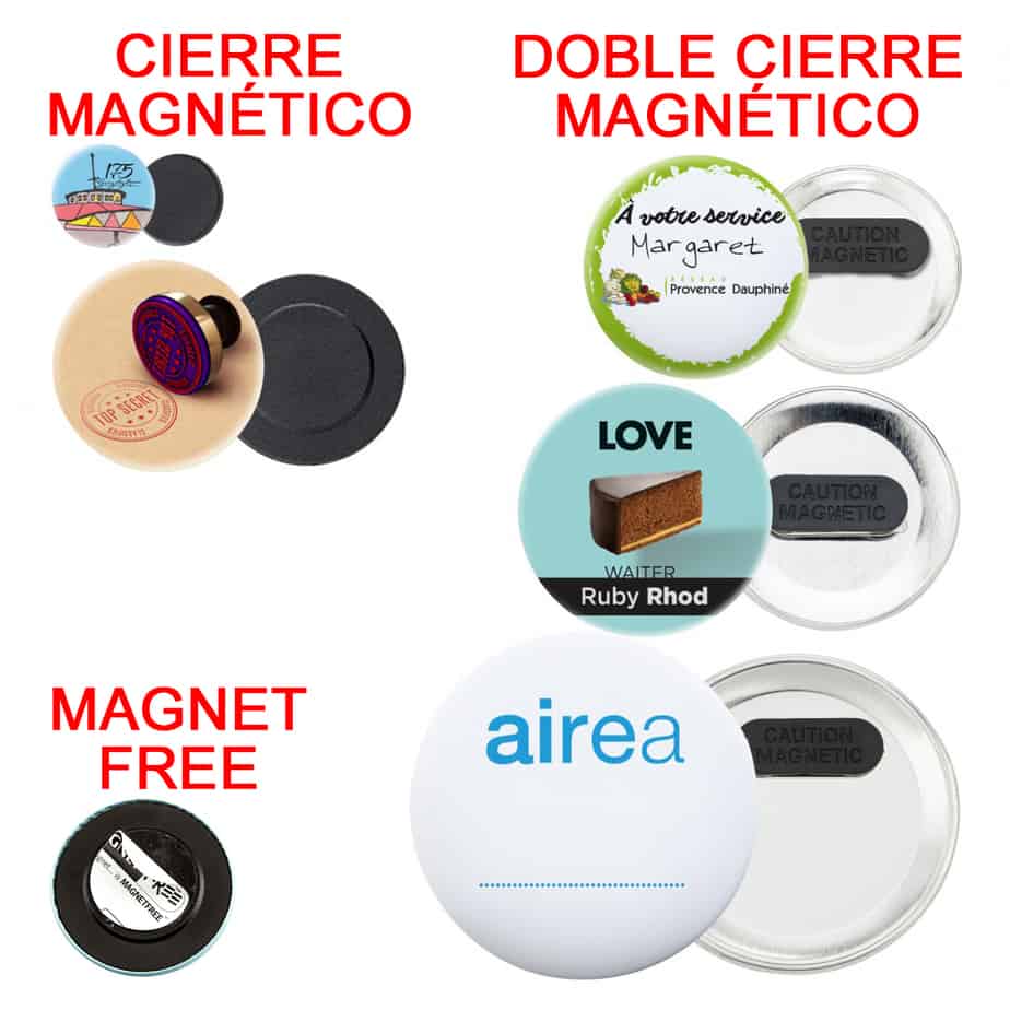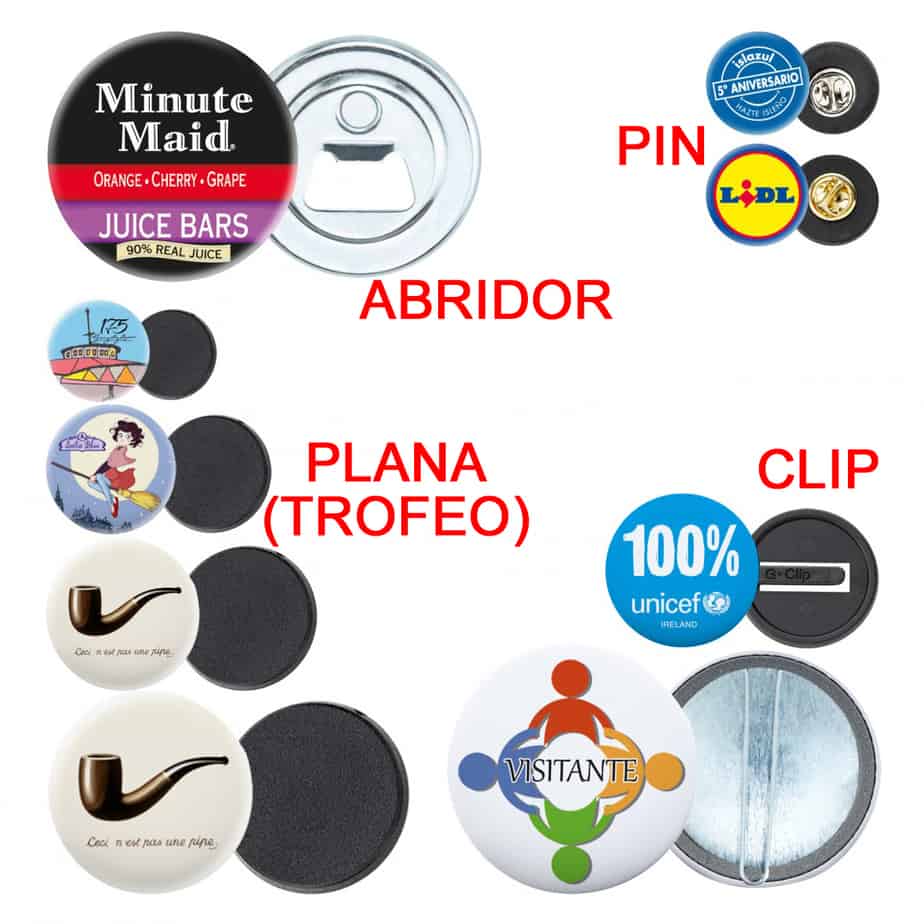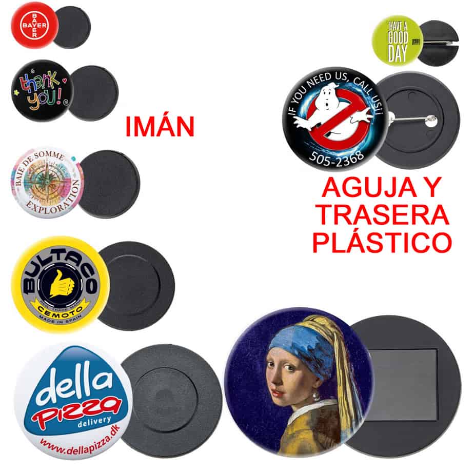 El clásico es la chapa con la parte trasera metálica y con alfiler, y por eso es la disponible en todos los tamaños. Además en algunos de ellos se puede cambiar la trasera metálica por una de plástico.