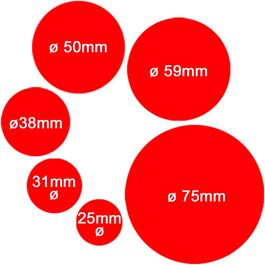 Son muy versátiles, se diseñan totalmente a medida, y están disponibles desde 25mm de diámetro hasta 75mm, pasando por muchos tamaños intermedios, y todas las diferentes opciones traseras. Tú eliges.